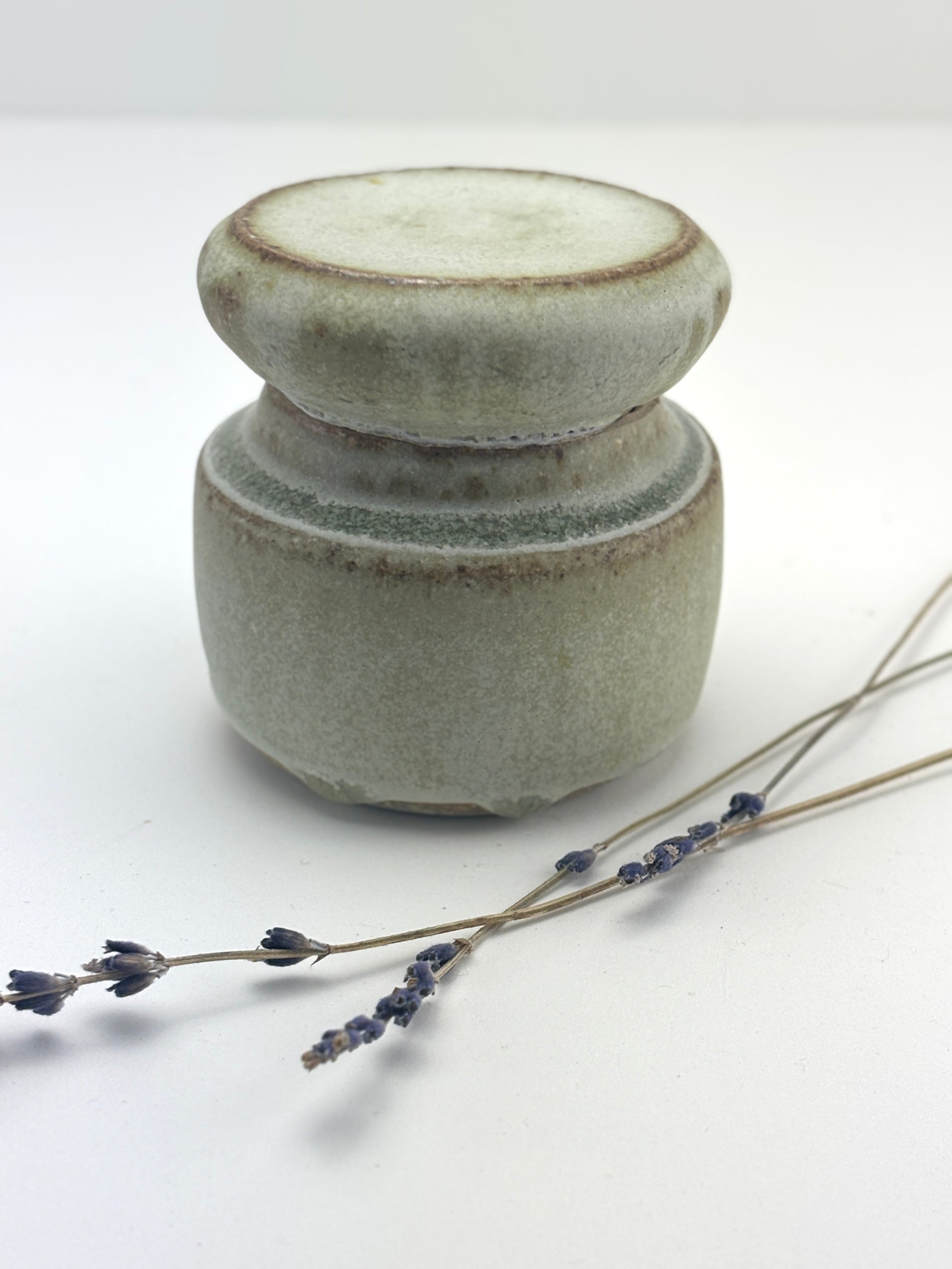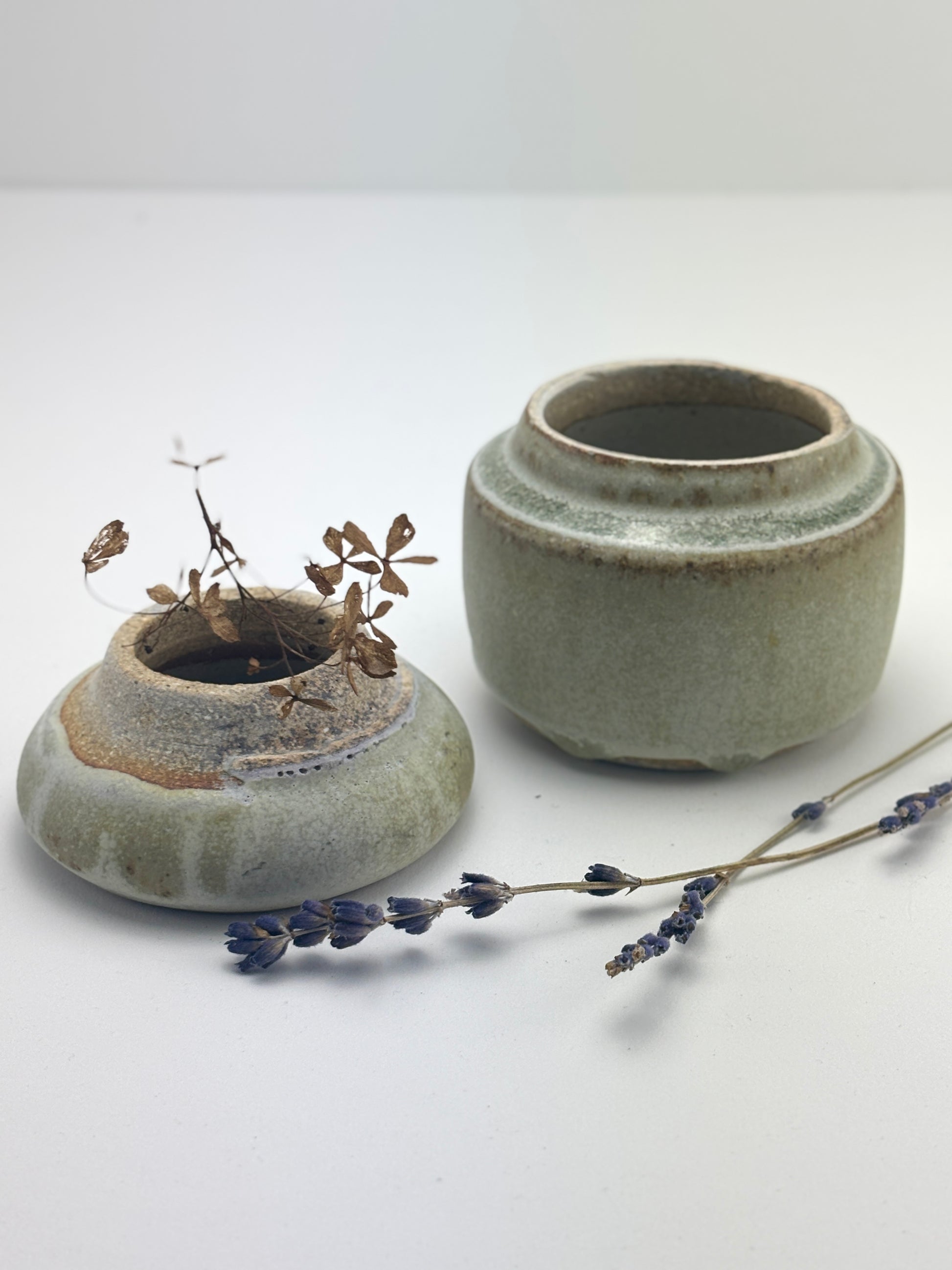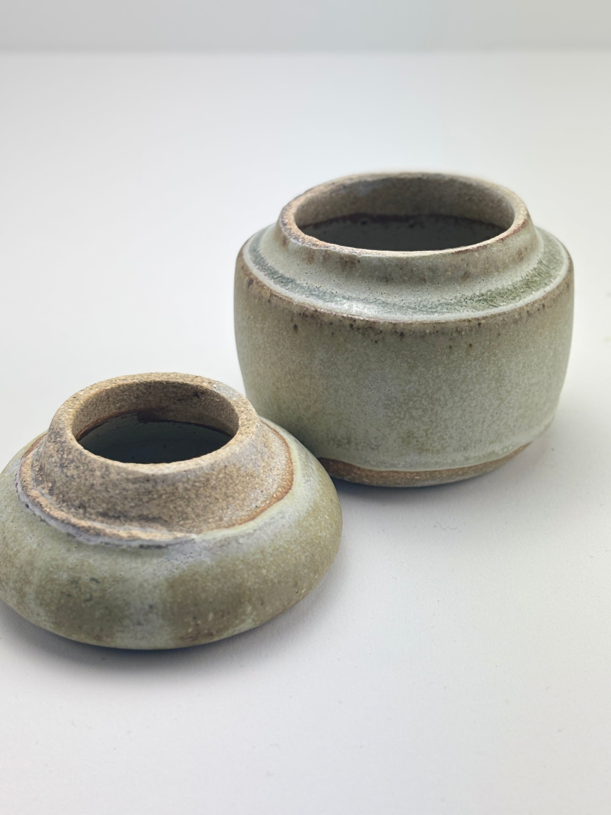 High fired stoneware hand thrown pair of vessels, use as a jar or two bud vases, interior watertight liner glaze. Rain glaze is part of the Atmosphere Collection of glazes developed by Beth Elliott Studio.