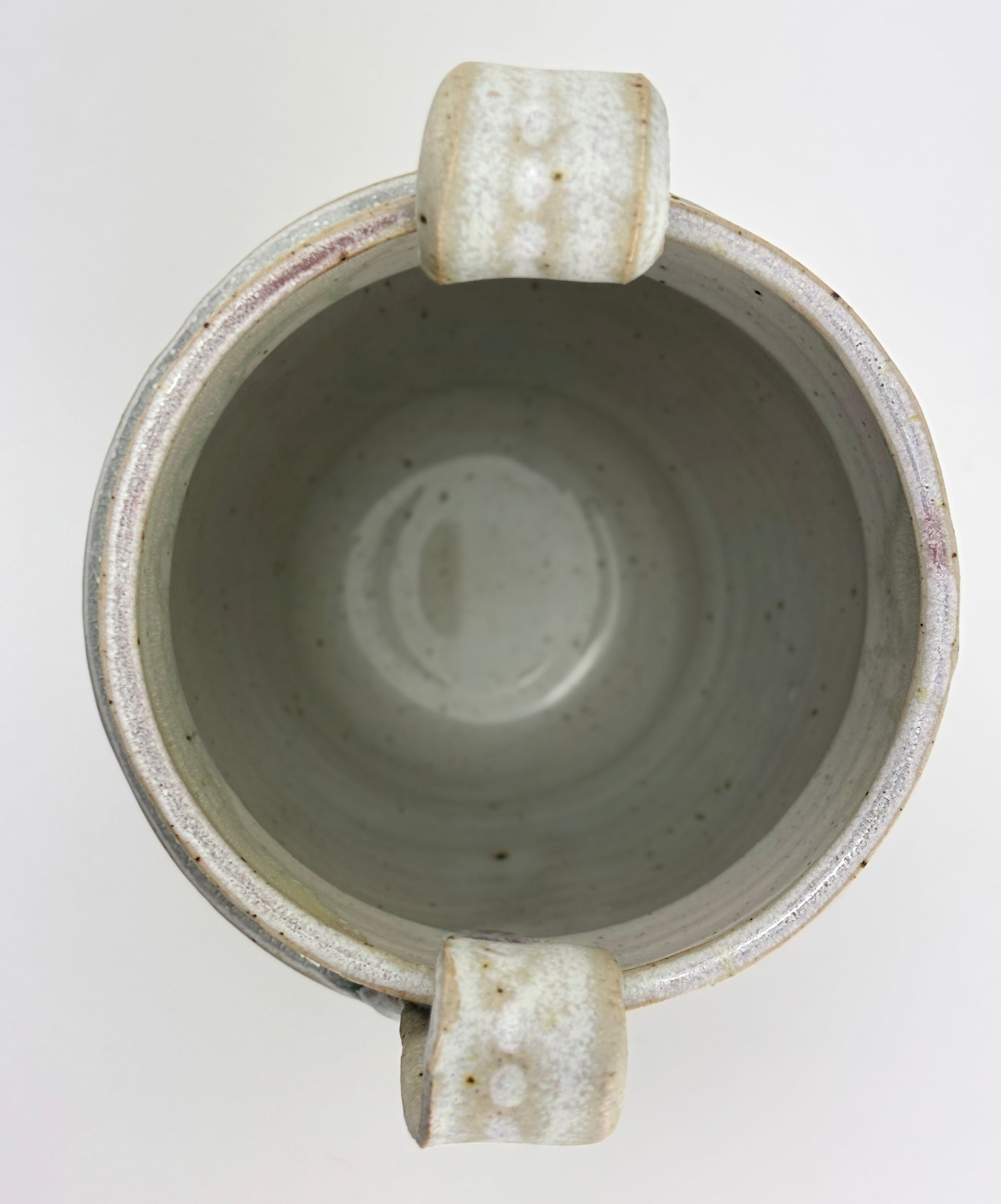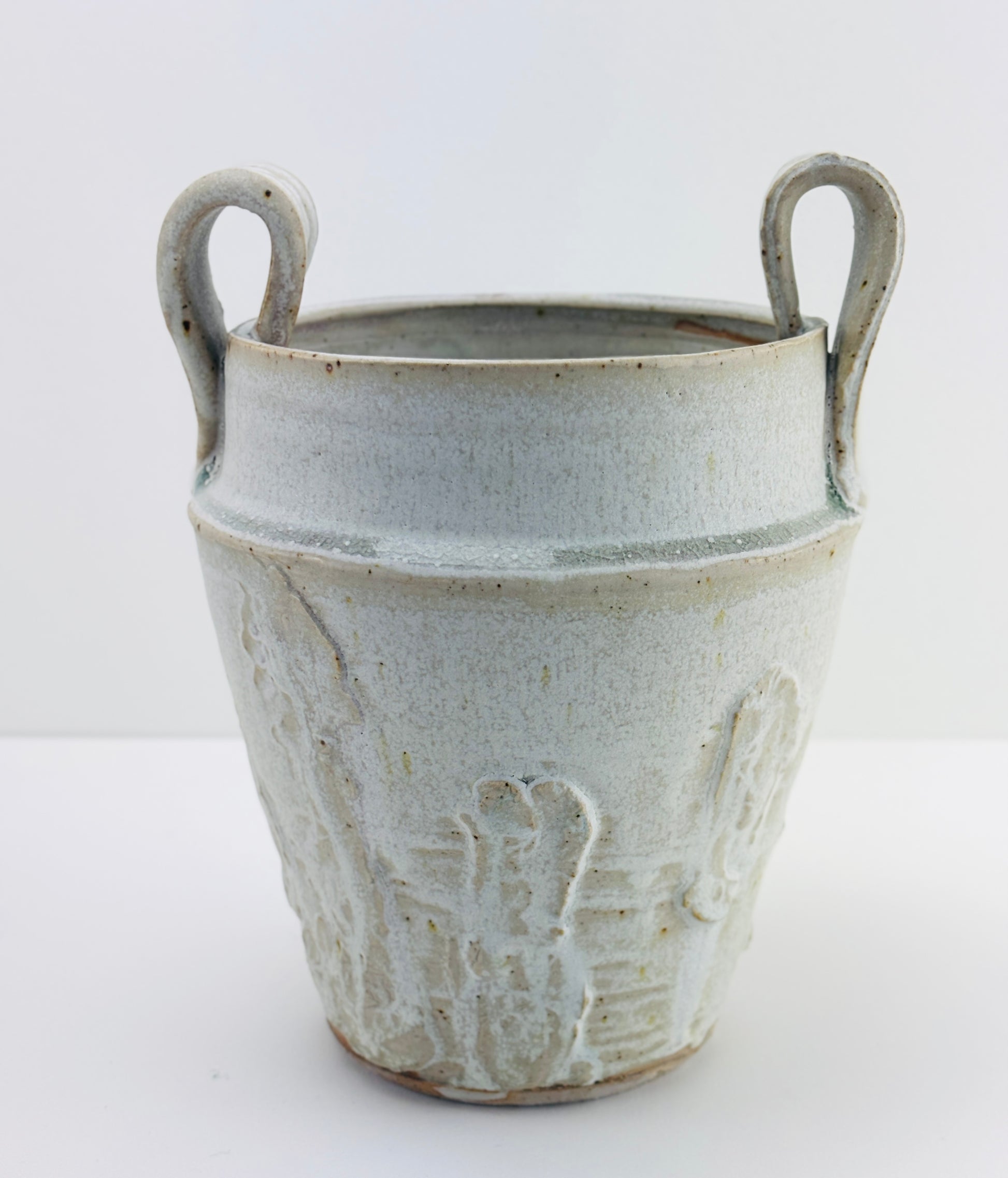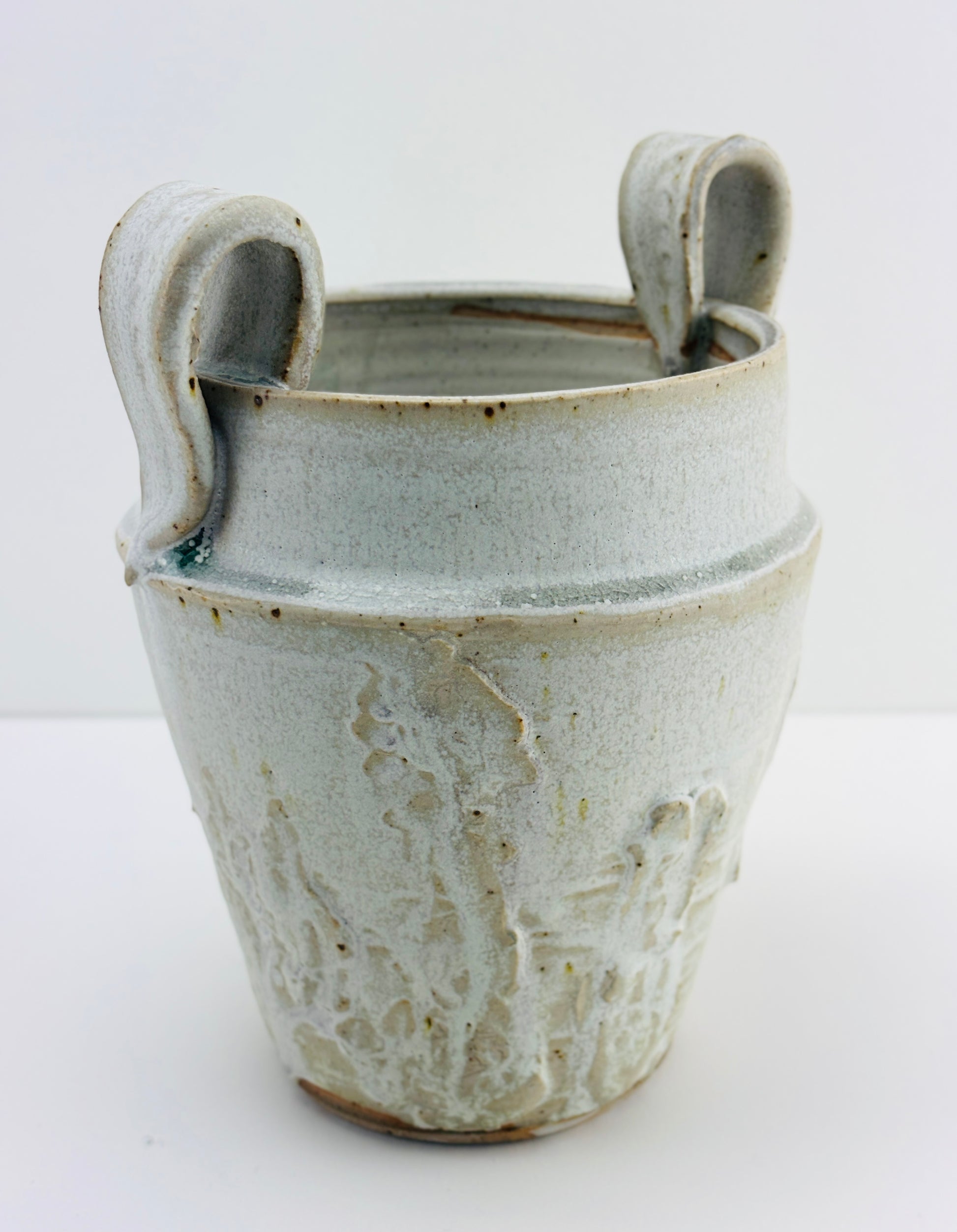 hHigh fired stoneware hand thrown and altered vessel, interior watertight liner glaze. Fog Bow glaze is part of the Atmosphere Collection of glazes developed by Beth Elliott Studio. Watertight, can use as a cachepot for plants or as a vase. 7.5x6x5.25”
