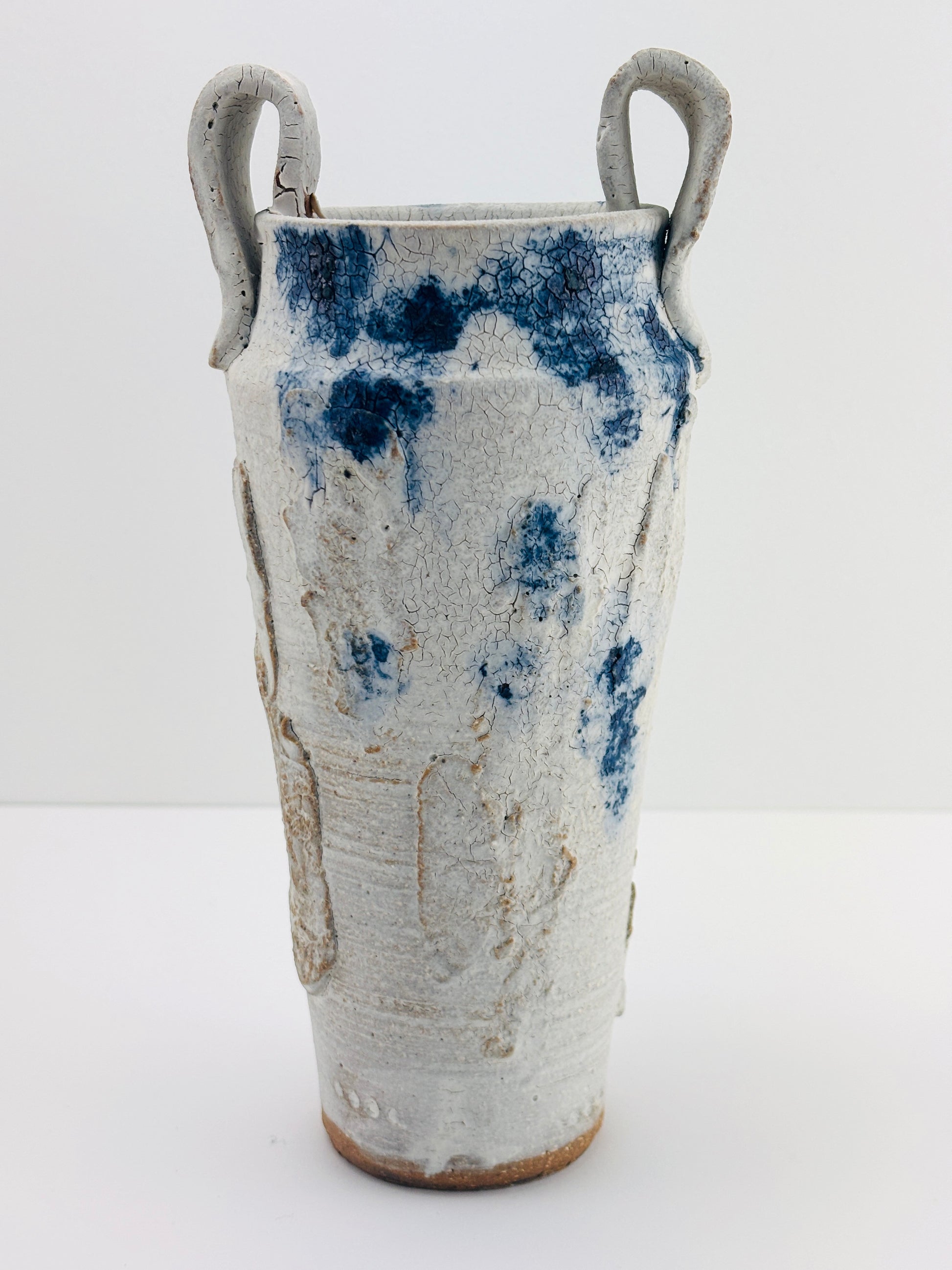 High fired stoneware hand thrown and altered vessel, interior watertight liner glaze, exterior slips and oxides. Crackle Sky glaze is part of the Atmosphere Collection of glazes developed by Beth Elliott Studio. Watertight, can use as a cachepot for plants or as a vase.