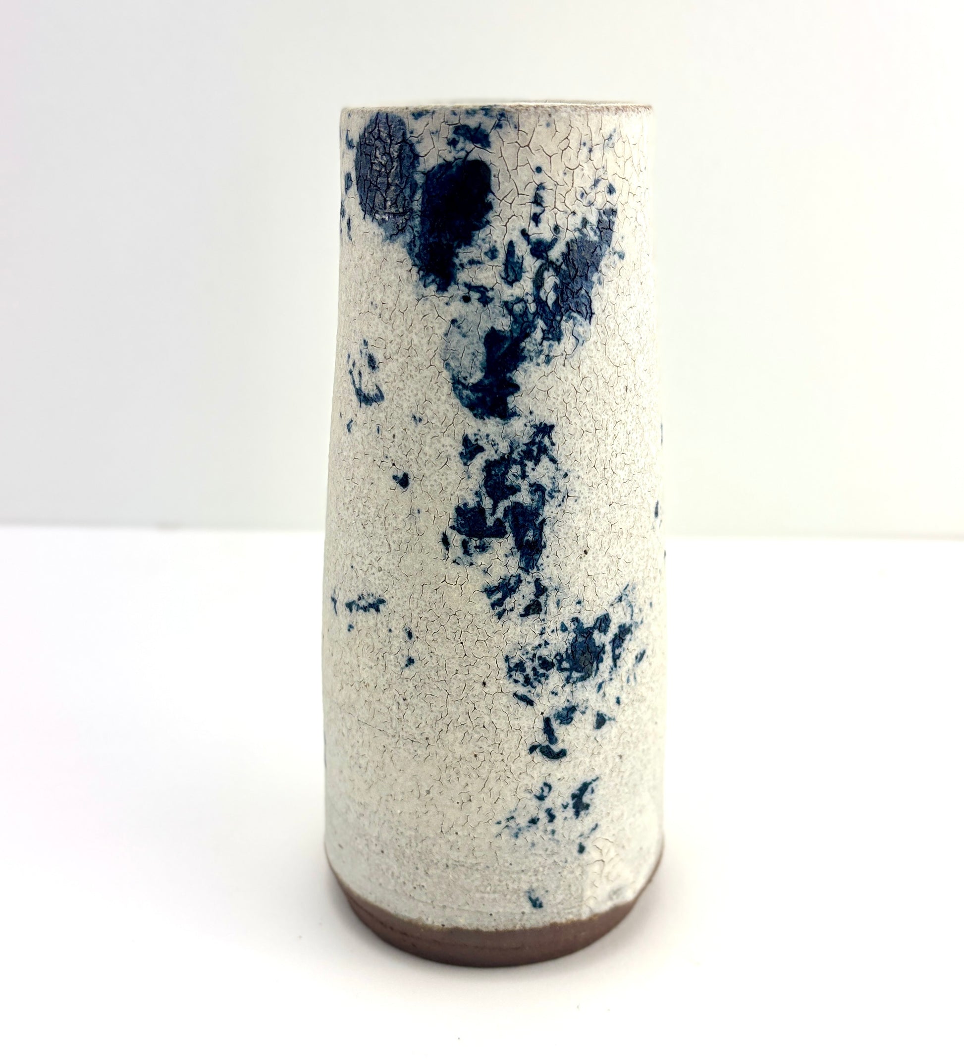 High fired stoneware hand thrown vessel, interior watertight liner glaze. Crackle Sky is part of the Atmosphere Collection of glazes developed by Beth Elliott Studio. 6.5x3x3”