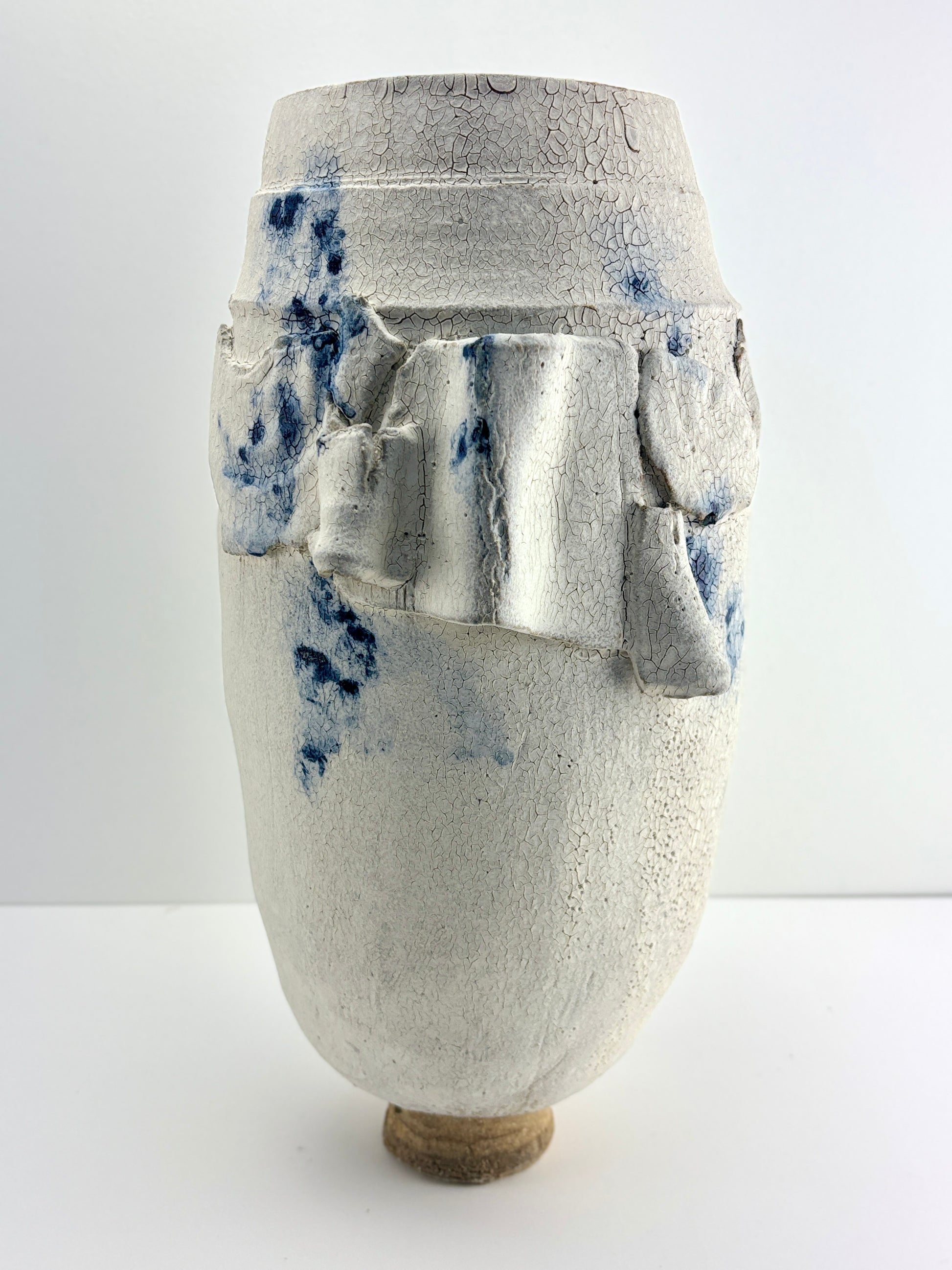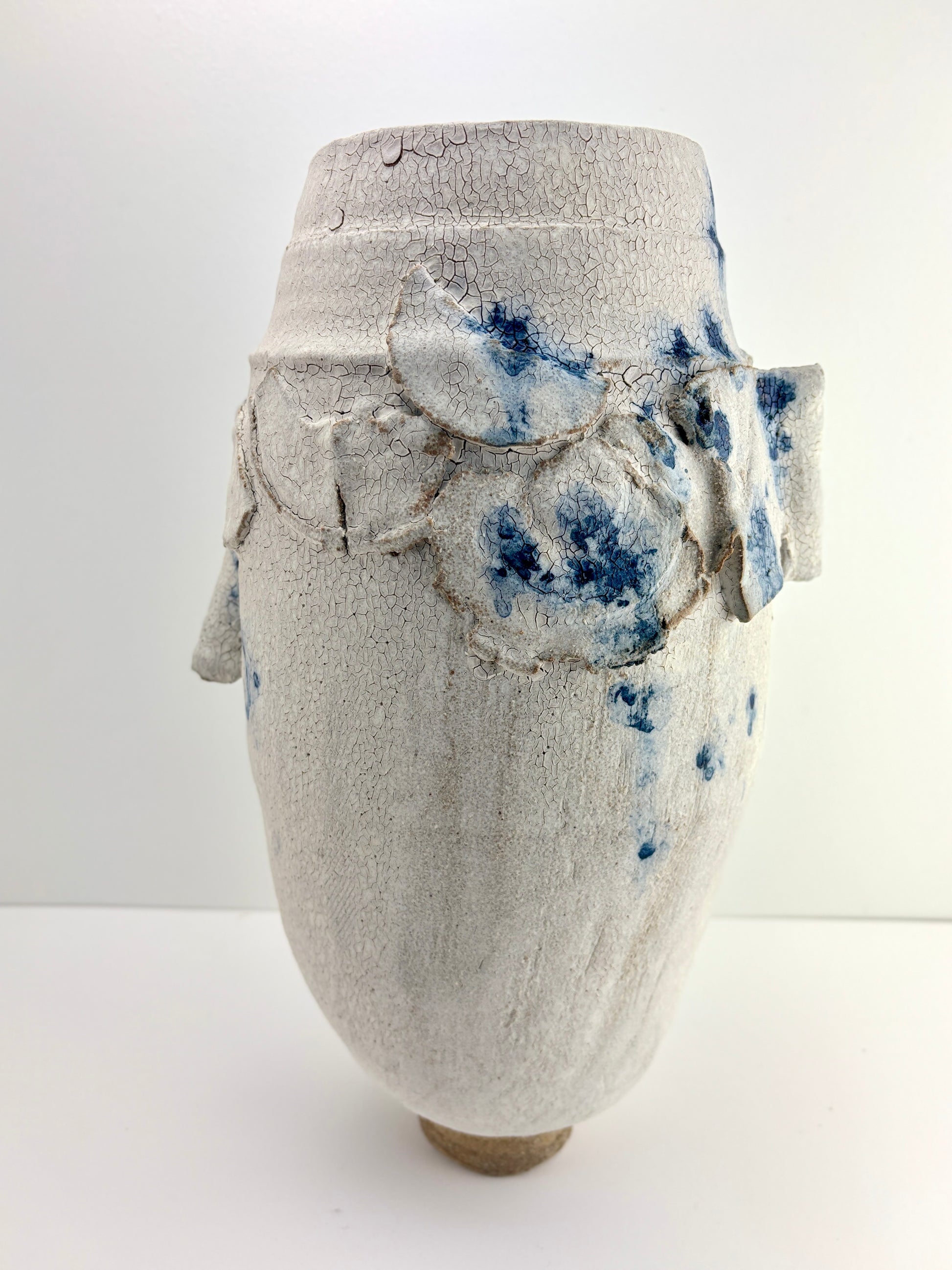 High fired stoneware hand coiled and thrown vessel, interior watertight liner glaze, exterior slips and oxides. Crackle Sky glaze is part of the Atmosphere Collection of glazes developed by Beth Elliott Studio. Watertight, can use as a vase or sculptural art.