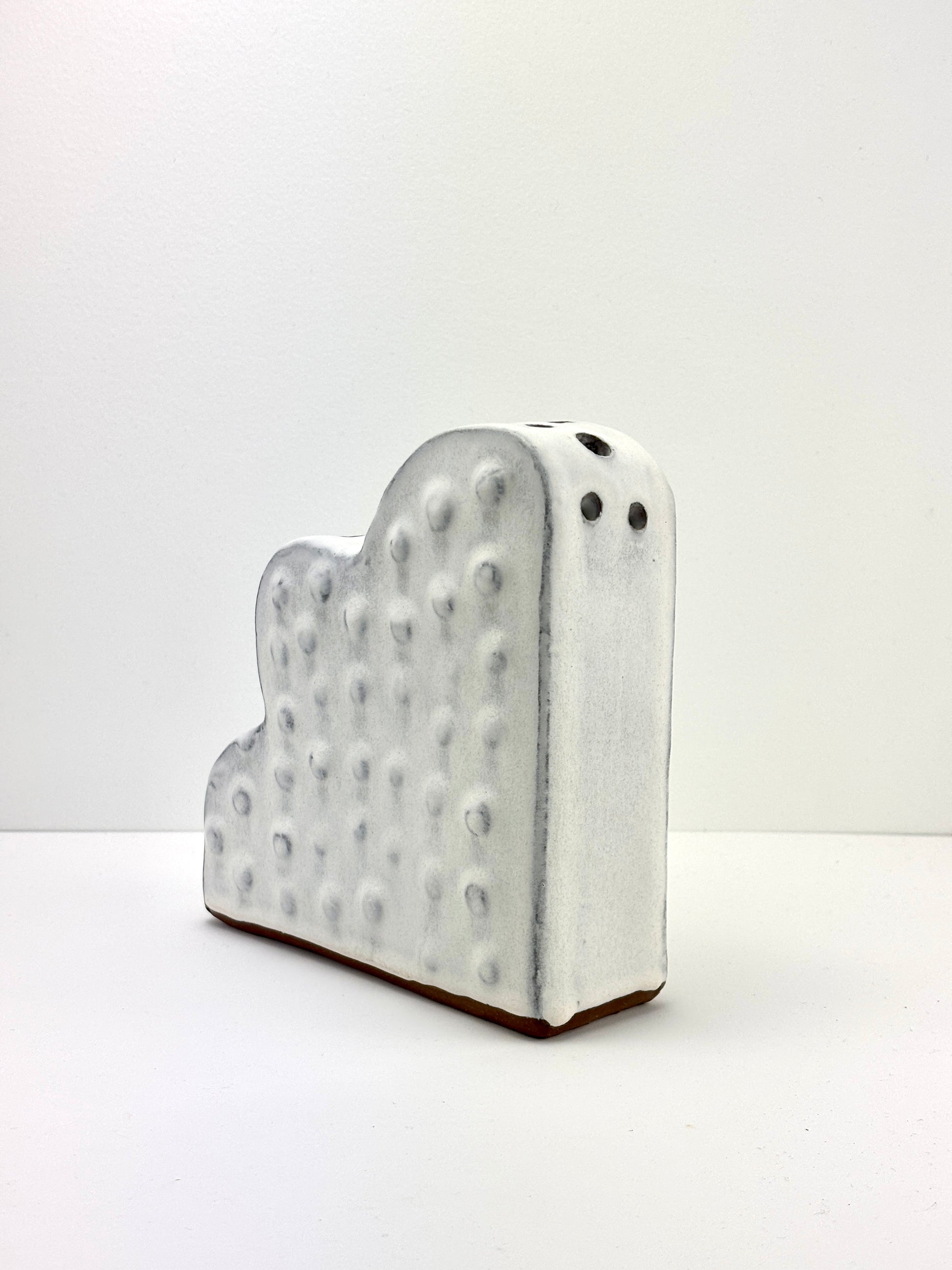 Hand built flower brick in dotted texture, cumulus glaze.. High fired stoneware vessel with exterior satin matte glaze.