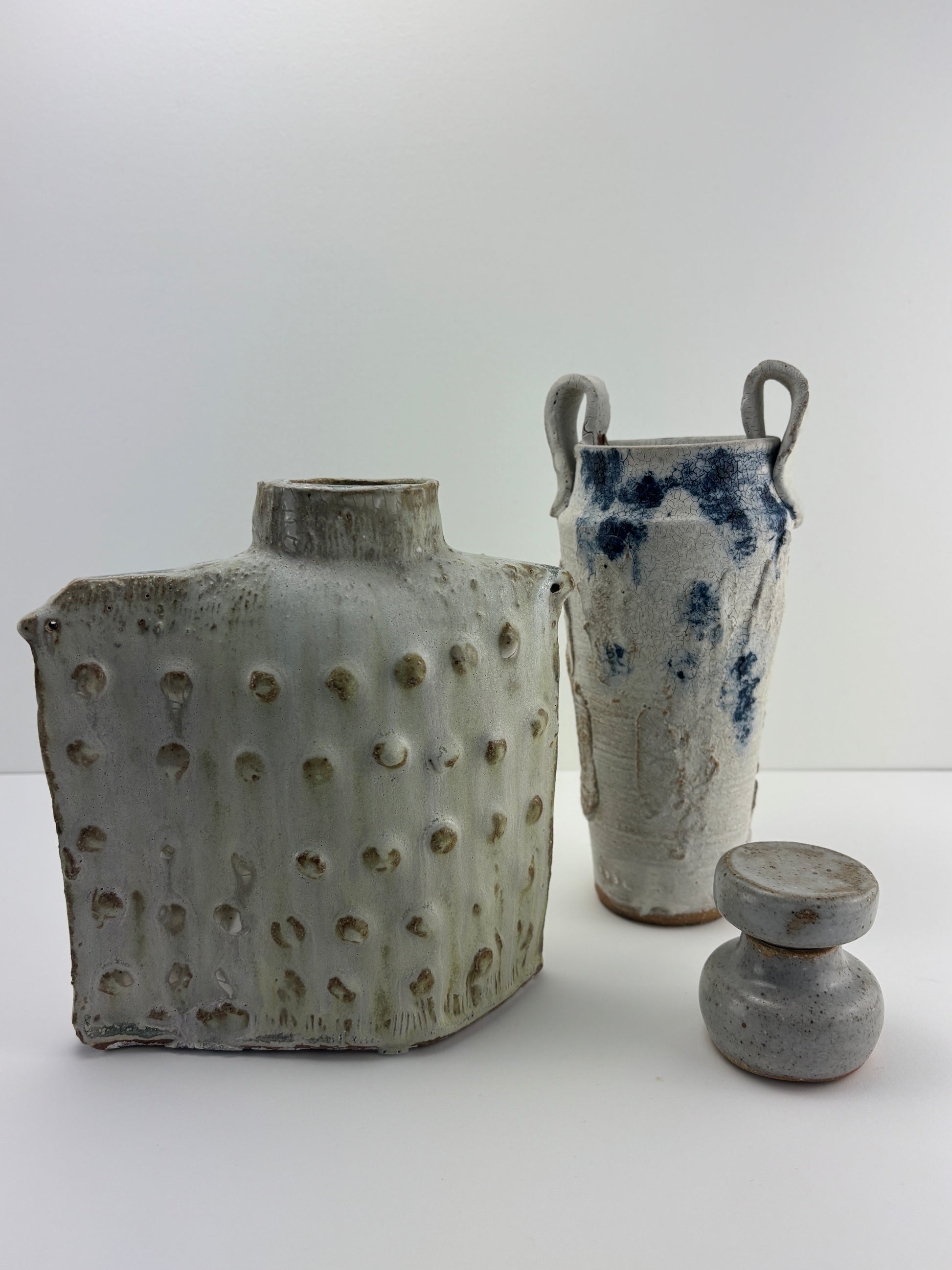 High fired stoneware hand built altered vessel, interior watertight liner glaze. Fog Bow glaze is part of the Atmosphere Collection of glazes developed by Beth Elliott Studio. Watertight, can use as a cachepot for plants or as a vase. This textured vase stands solo or in a grouping with or without flowers!
