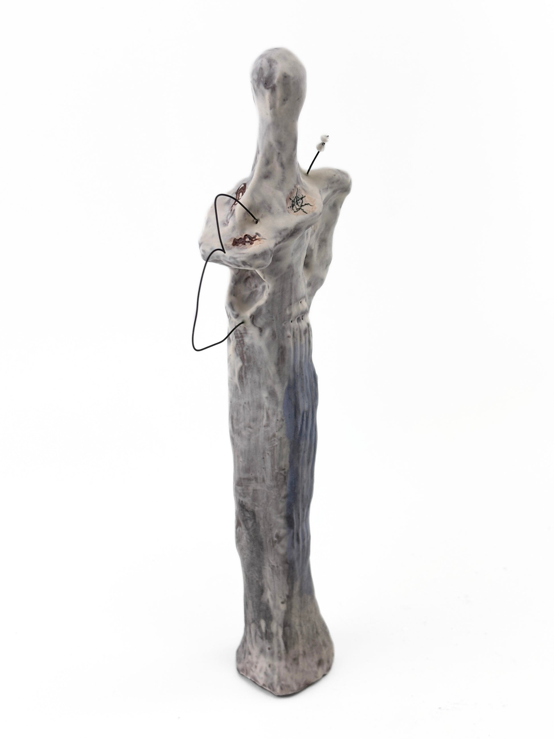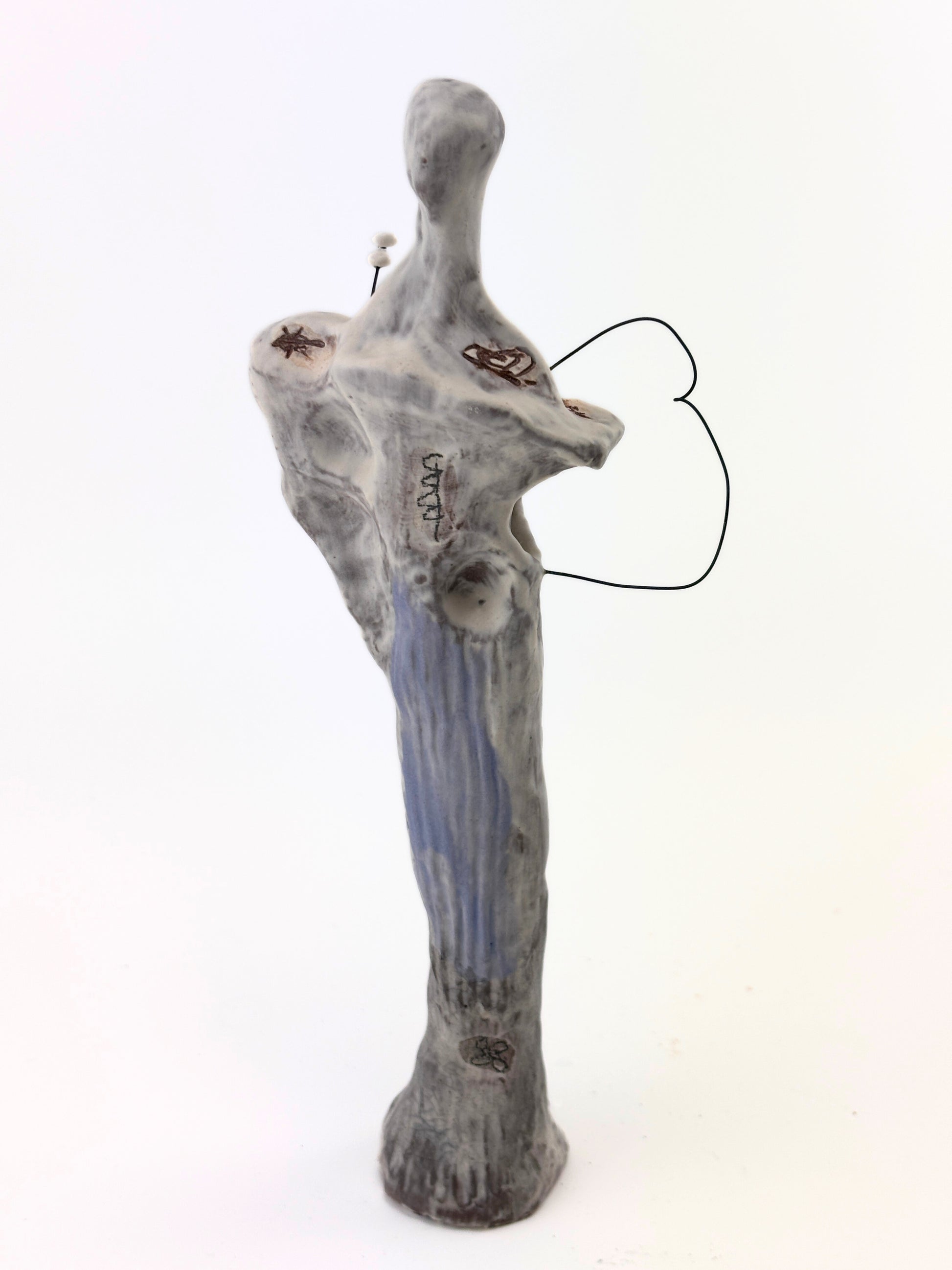 high fired stoneware vessel with slips, engobes, matte glaze, wire accents and porcelain beads, 10.25x4x1.75”