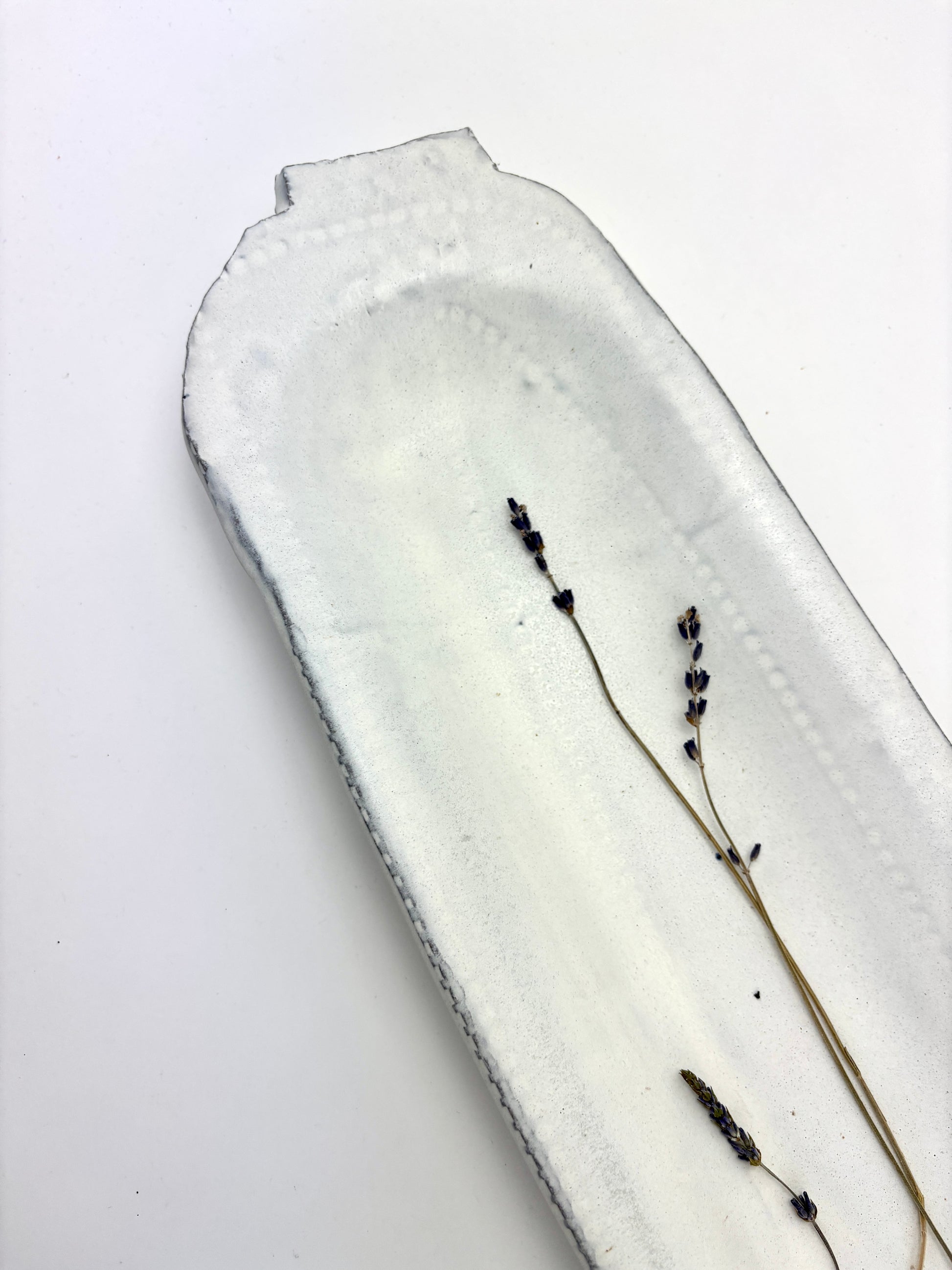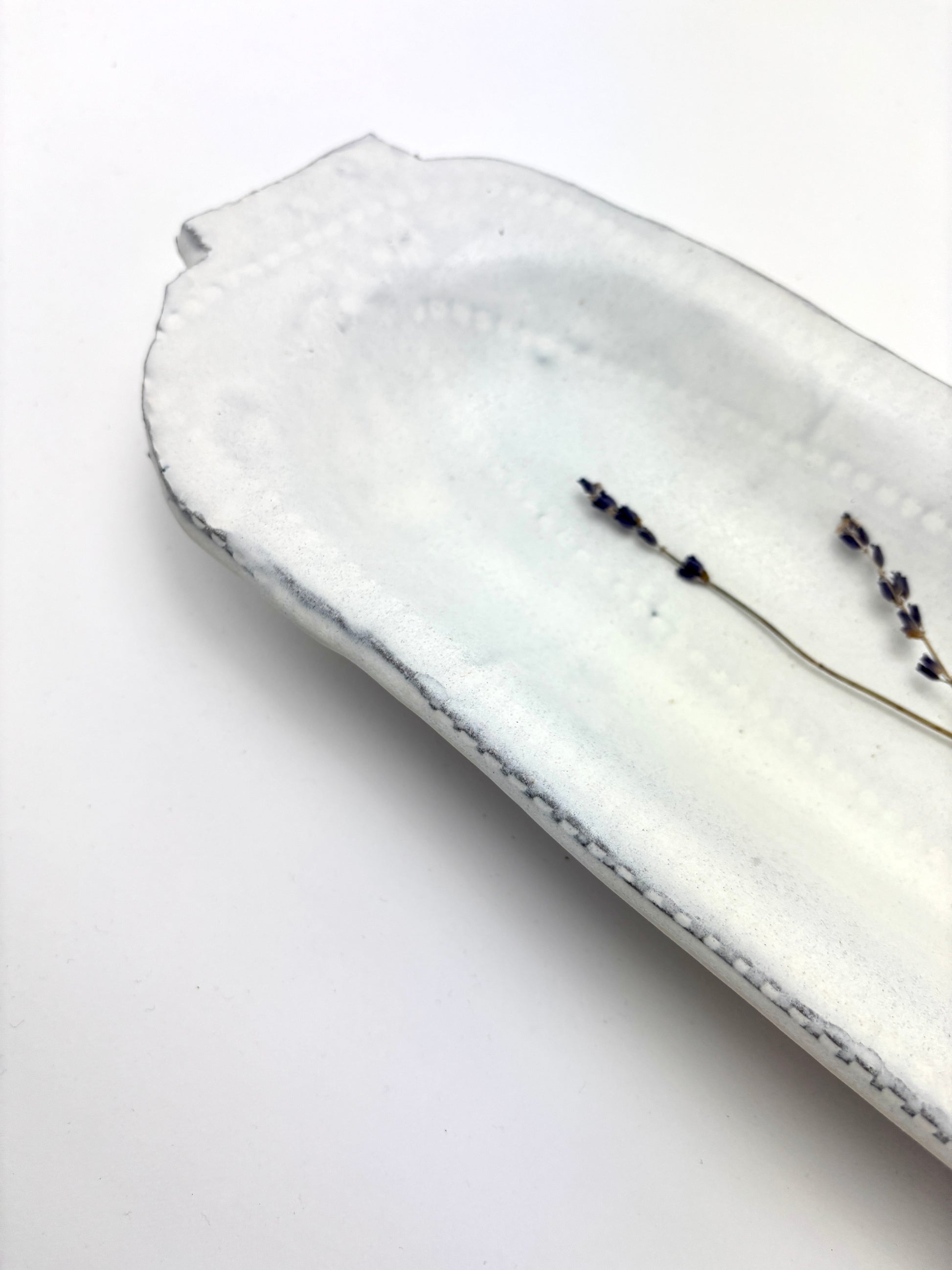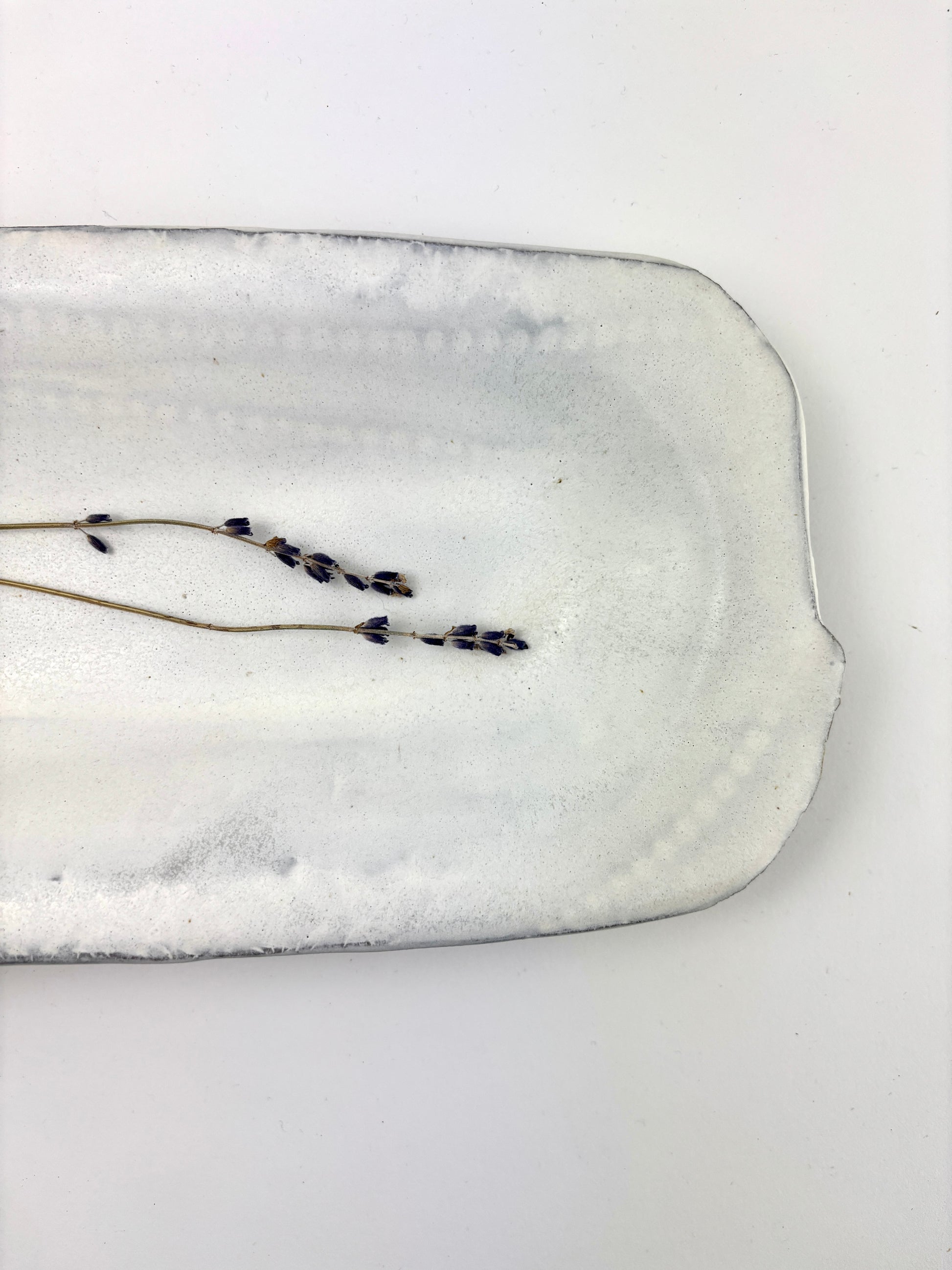 Hand built one of a kind serving bowl platter. Organic rim elongated bowl shape, charcuterie, olives, baguette. Cumulus white is a matte glaze from the Atmosphere collection of glazes custom by Beth Elliott Studio.
