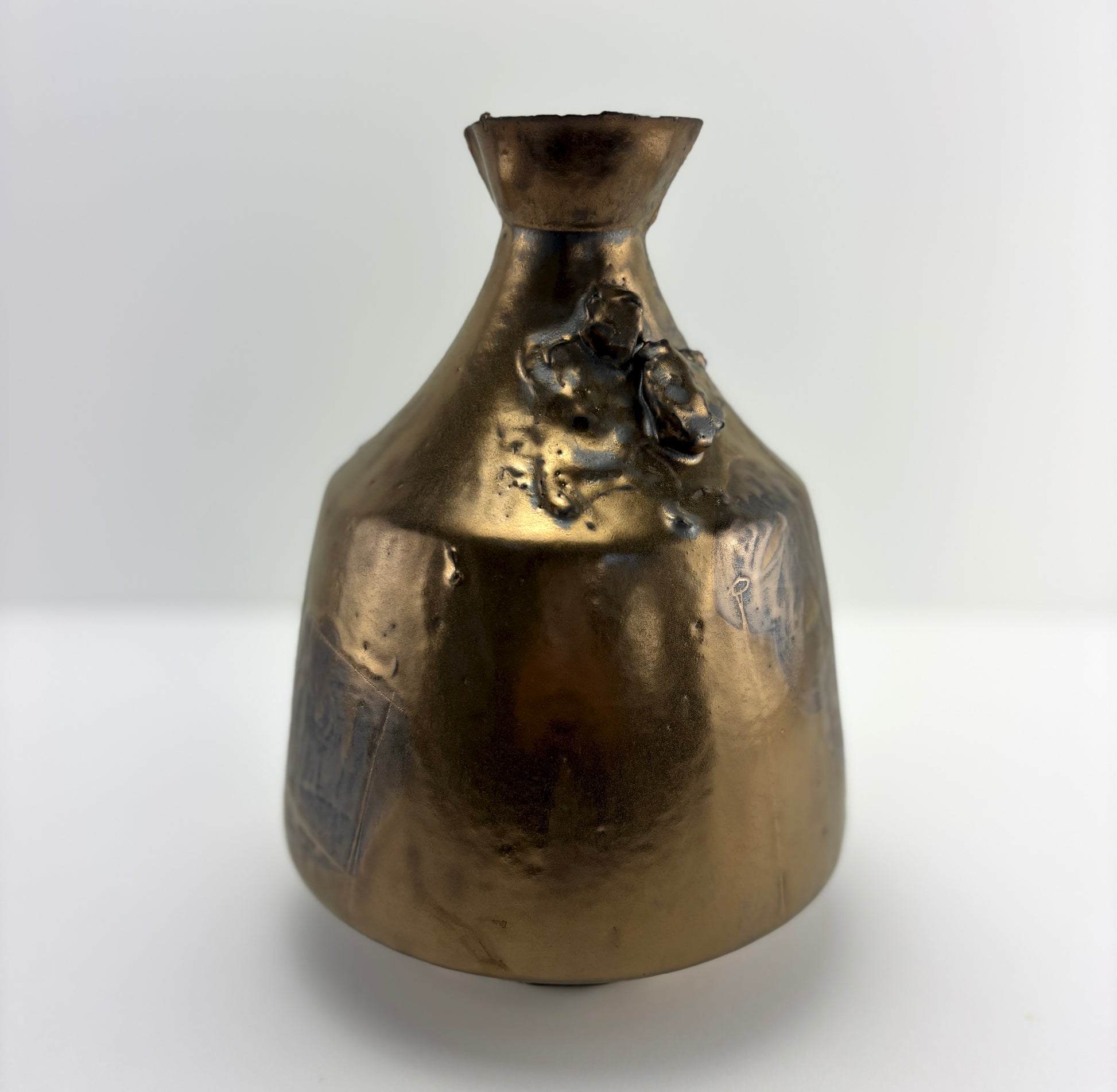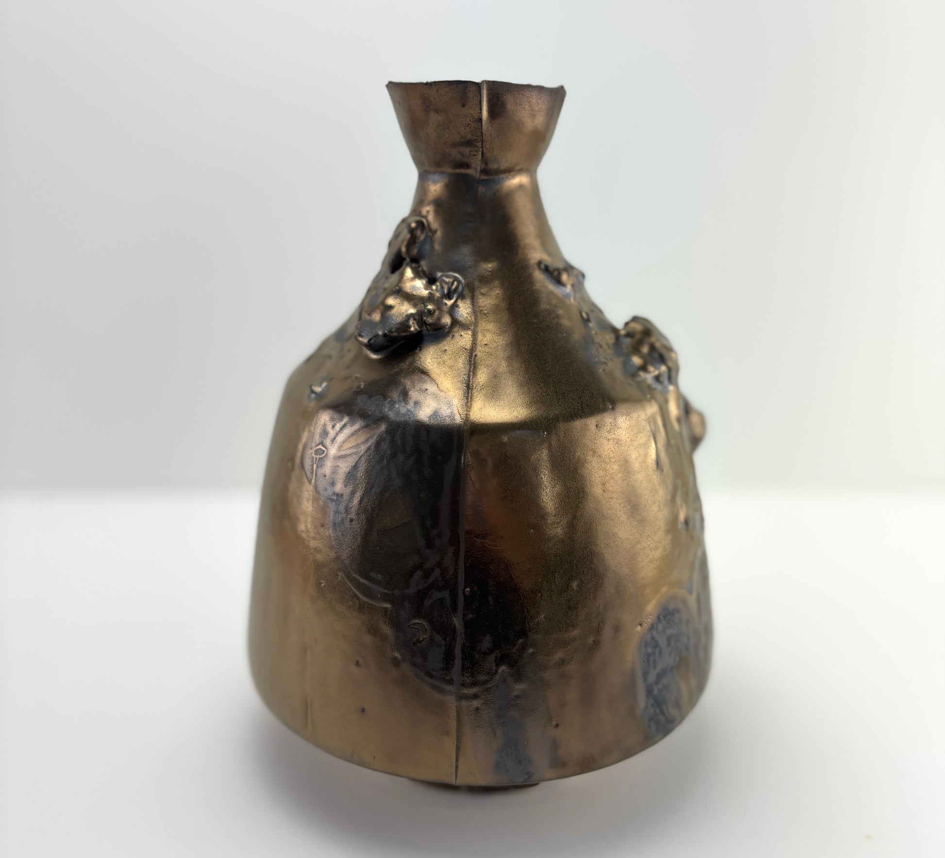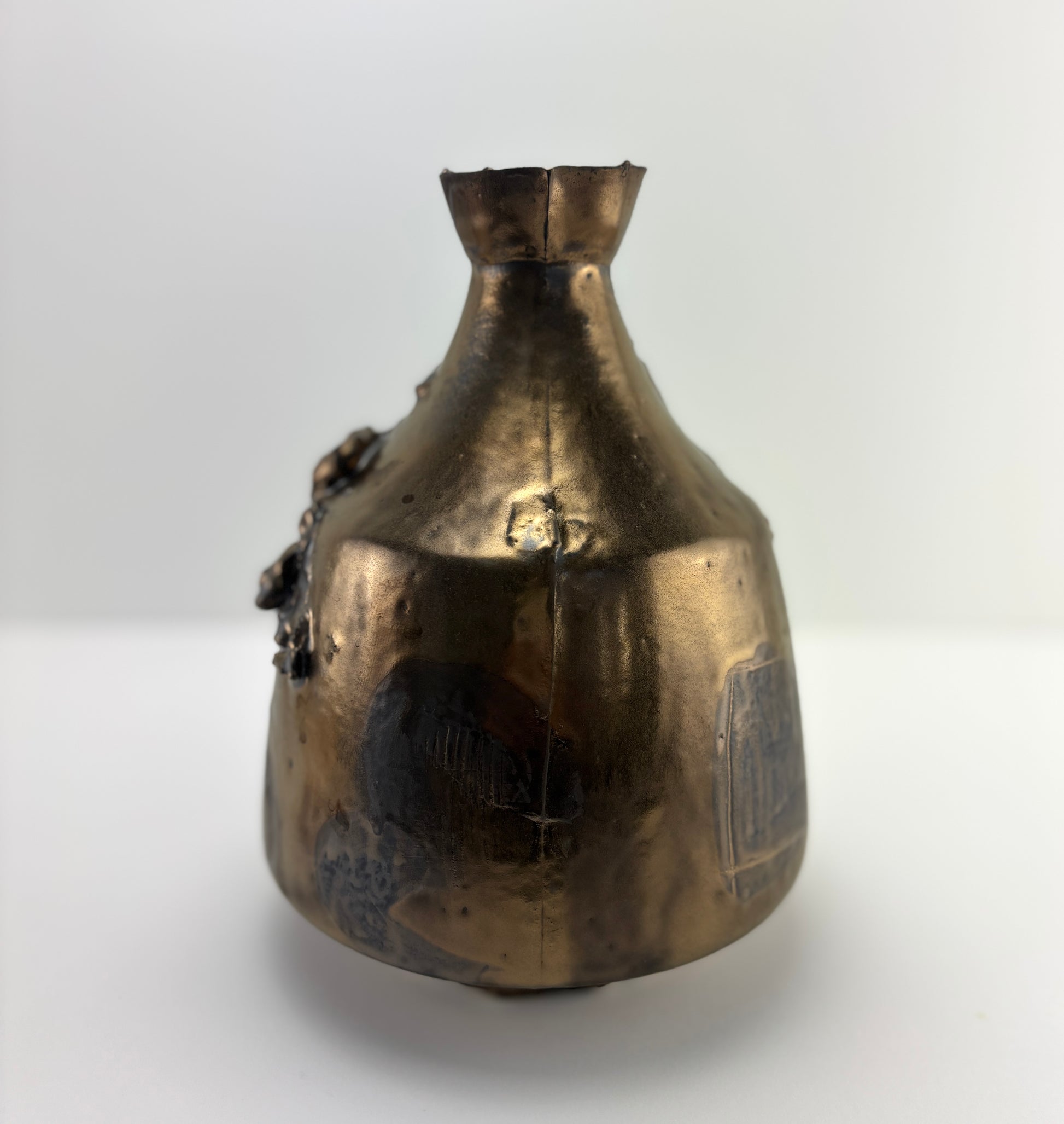High fired stoneware slipcase vessel, engobe markings and clay texture, finished with a metallic gloss glaze, if the petrichor scent was a color…… interior watertight liner glaze.