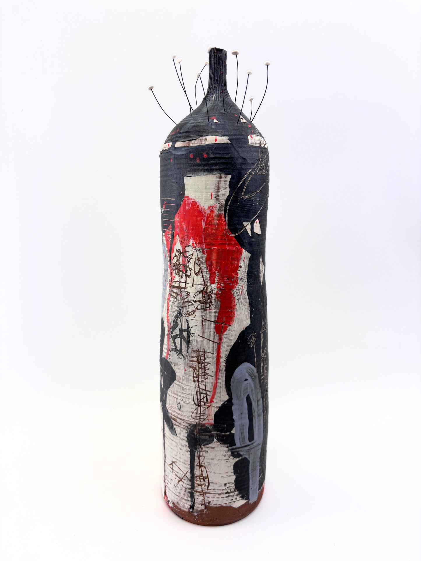 Materials- Native NC high fired stoneware, slips, engobes, porcelain beads, metal accents, clear matte glaze. Dry use.